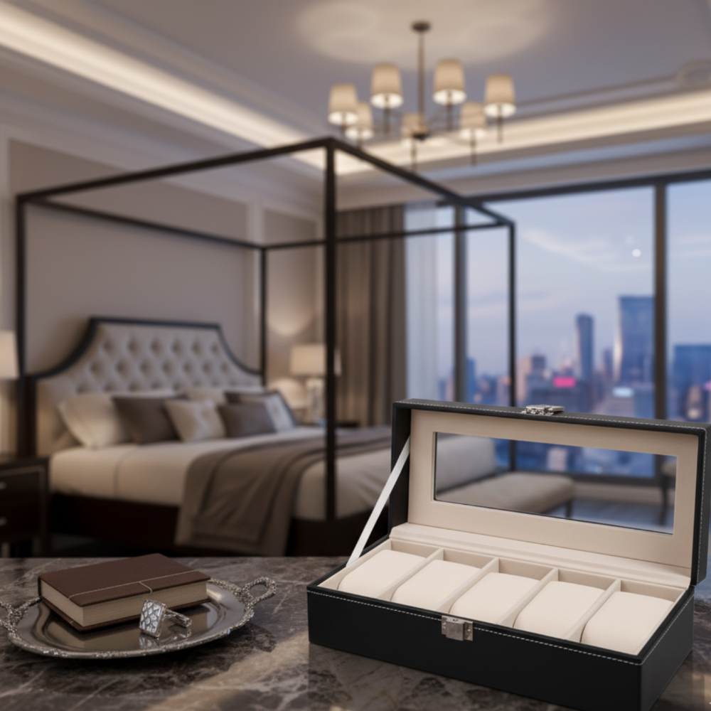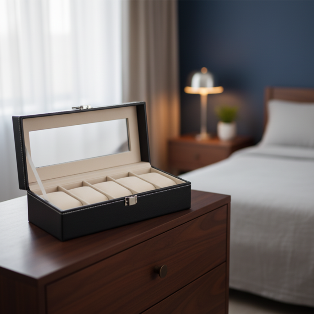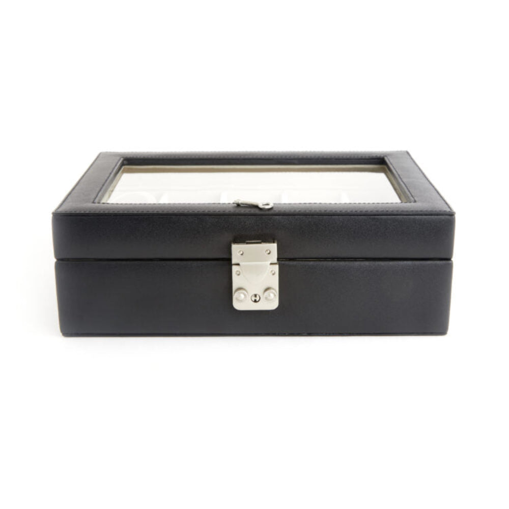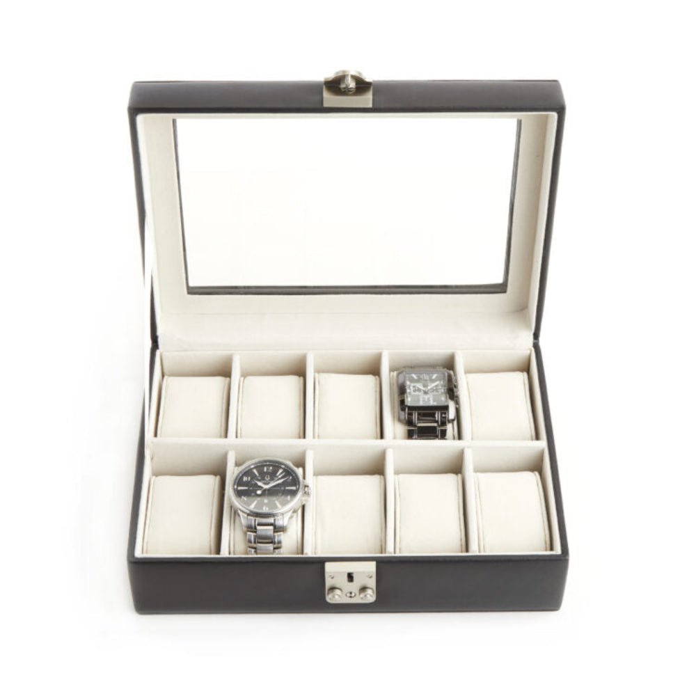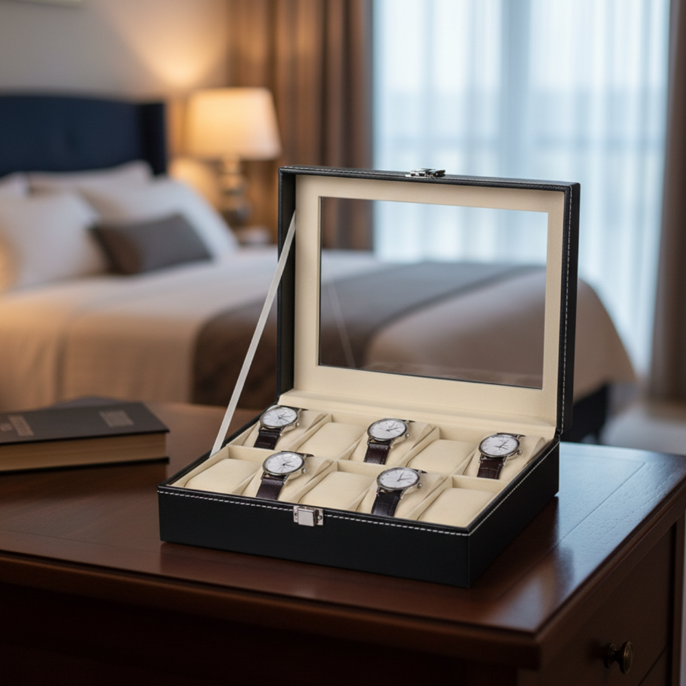 Optimisez l'organisation et la présentation de votre collection de montres avec notre boîte de rangement. Confectionnée en similicuir noir avec des surpiqûres blanches contrastées, elle donne un design moderne et professionnel. L'intérieur est rembourré de coussins en velours beige pour accueillir et protéger de 5 jusqu'à 10 (ou plus, selon le modèle spécifique) de la poussière et des chocs. Le couvercle transparent permet non seulement d'admirer vos pièces favorites d'un coup d'œil, mais aussi de les protéger grâce à son mécanisme de fermeture métallique sécurisé. C'est l'écrin idéal pour tout collectionneur cherchant à allier la sécurité, l'accessibilité et un style raffiné.