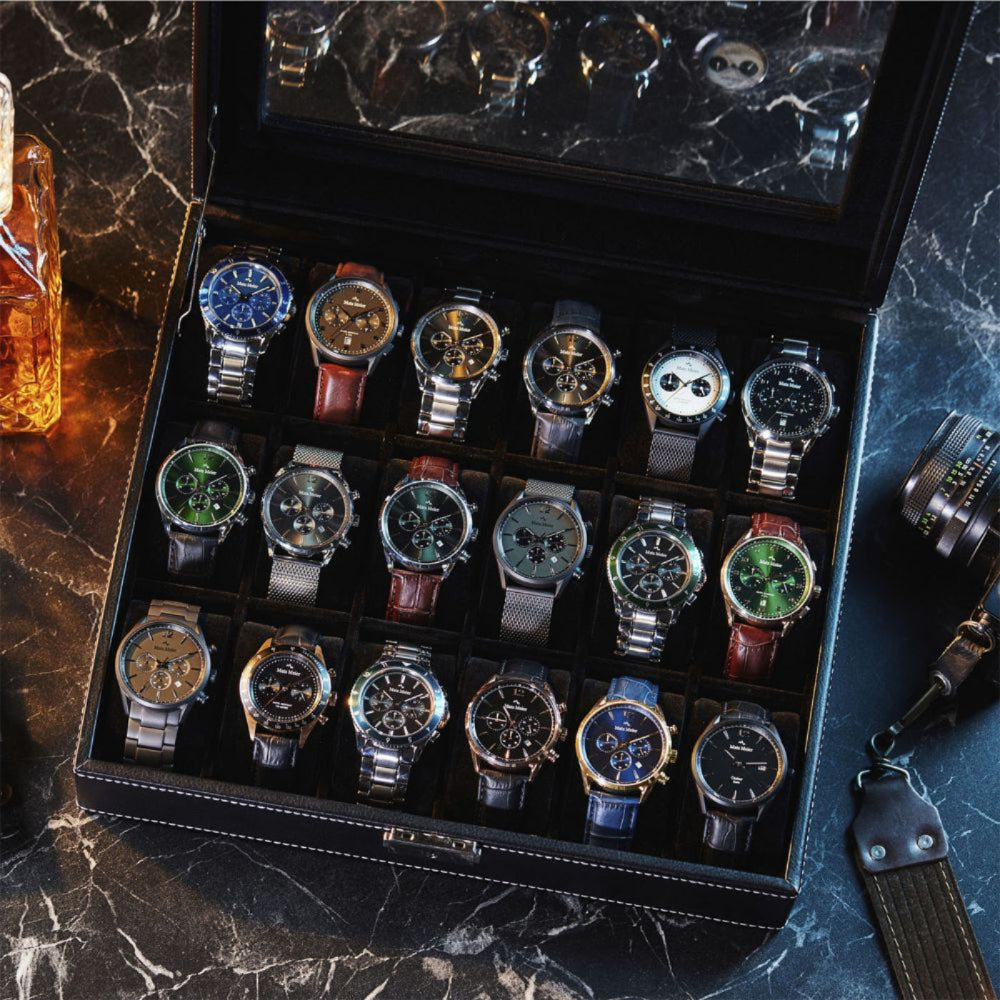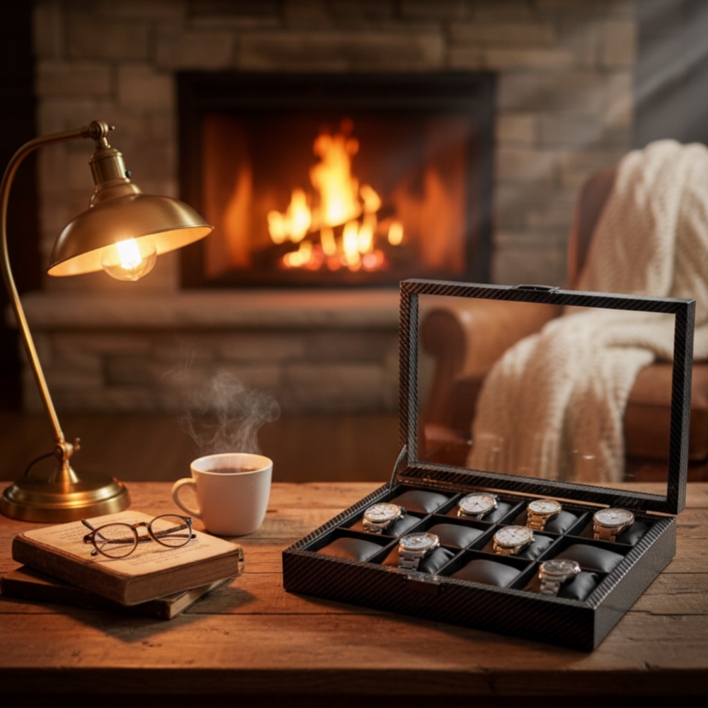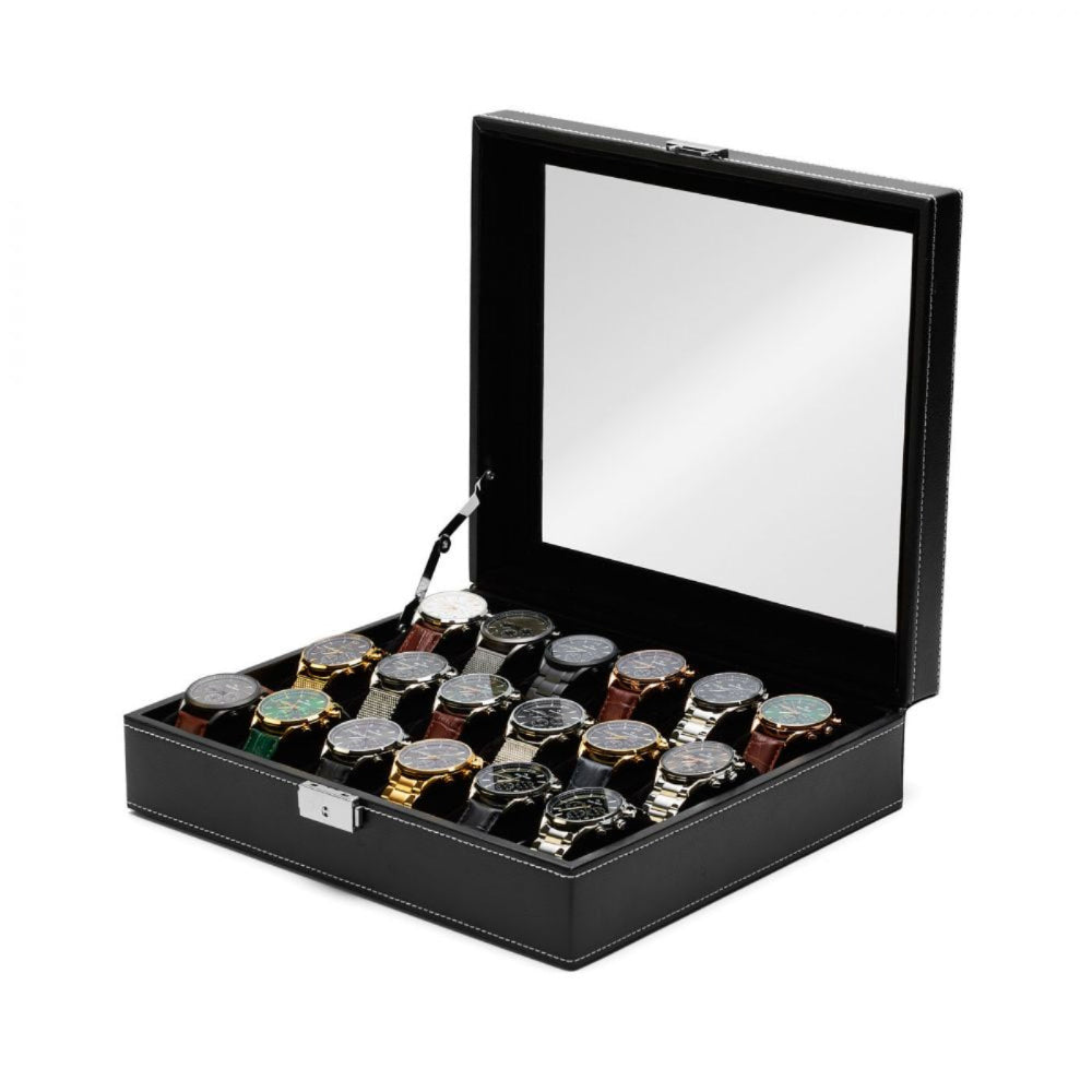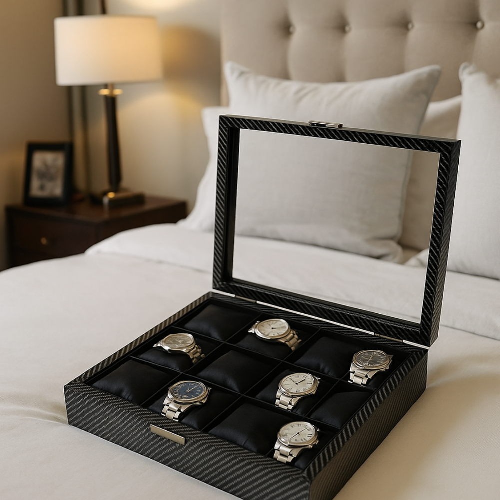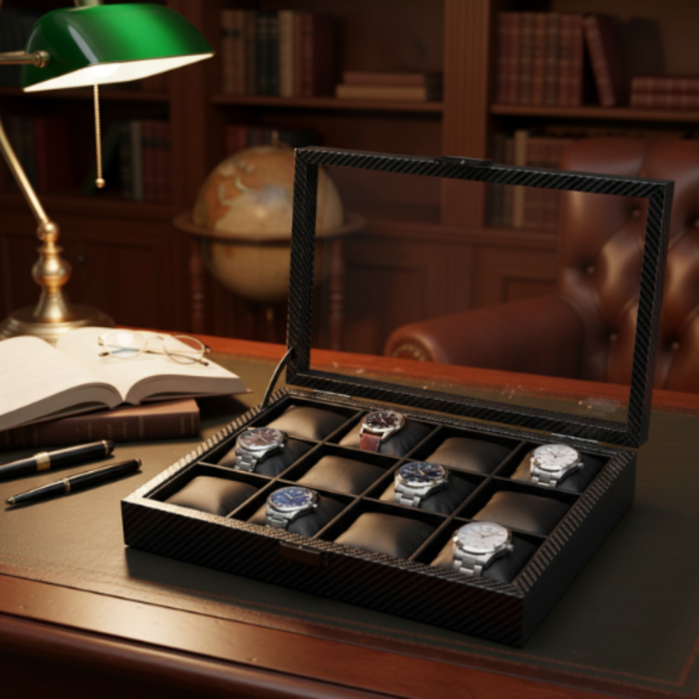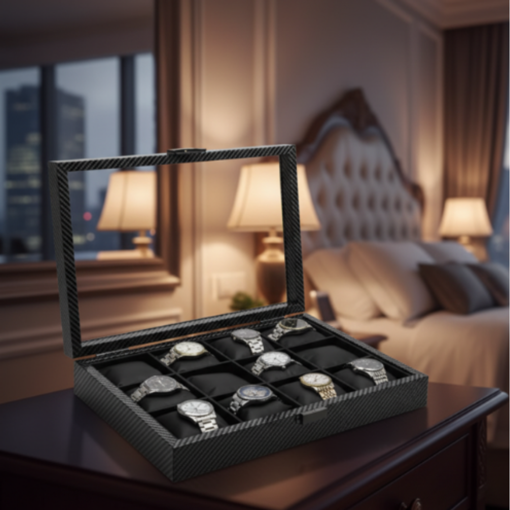 Adoptez l'esthétique moderne et la robustesse avec notre boîtier de montre haut de gamme, caractérisé par son élégant fini en fibre de carbone noire. Cet organisateur permet une protection maximale pour votre collection grâce à sa construction solide et à son intérieur tapissé d'un velours doux. Le couvercle transparent à bordure nette permet une visibilité directe, transformant le rangement en une vitrine d'exposition chic. Grâce à sa capacité optimale, et son fermoir métallique, cette boîte est l'écrin idéal pour préserver l'intégrité et l'éclat de vos montres tout en affirmant un style résolument contemporain.